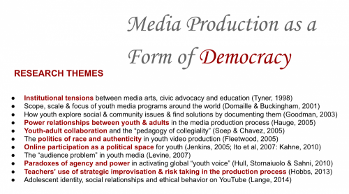 This session brings together six experts in video production to discuss the advantages and challenges of bringing video production into educational contexts to promote the democratization of education in the digital age. Participants on the panel will learn about the history of video production in education and current uses in school and out of school with/by children and adolescents. The four case studies will uncover the benefits of using video production to promote academic, social, and emotional skills. In addition, the presenters will share the limitations and barriers to advance democratic discussion and inclusion by using video production. The diverse cases and panelists will challenge traditional approaches to democratic education and will offer new lenses for future applications.